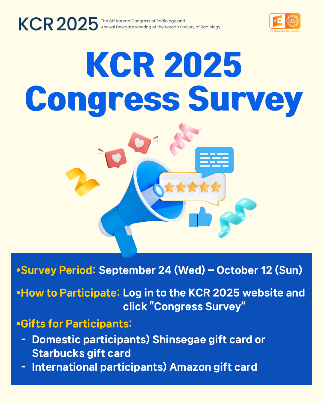 (1) Survey Period: September 24 (Wed) – October 12 (Sun) (2) How to Participate: Log in to www.kcr4u.org and click “Congress Survey.” (3) Gifts for Participants: • Domestic participants – Shinsegae or Starbucks gift card • International participants – Amazon gift card